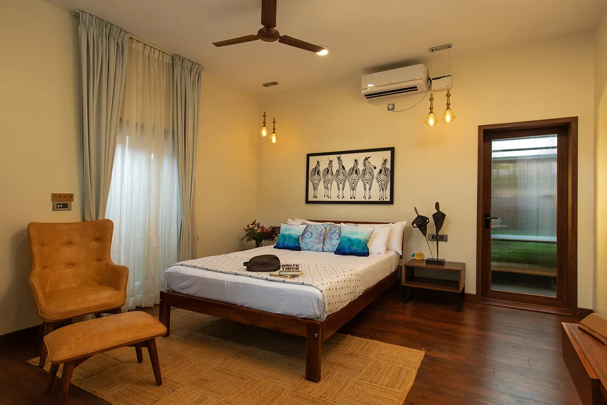 Set on the pool front, Bilva is designed as a romantic retreat for couples. Its zebra-inspired art and mood lighting create a distinctive ambiance, anchored by an American queen-size bed. Thoughtful details make it a sanctuary of style and intimacy. The room is reserved for two adults, with space to welcome an infant up to eight years old. No extra beds are permitted.