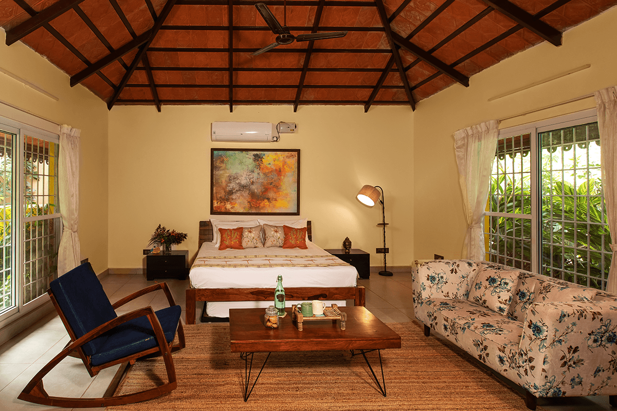 Parijatha, an iconic room with a sit-out space overlooking the pool, exudes charm with its wooden partition, study table, and wardrobe. Featuring large Italian tile flooring, and vibrant abstract paintings, this pet-friendly haven preserves the essence of Kerala’s architecture.