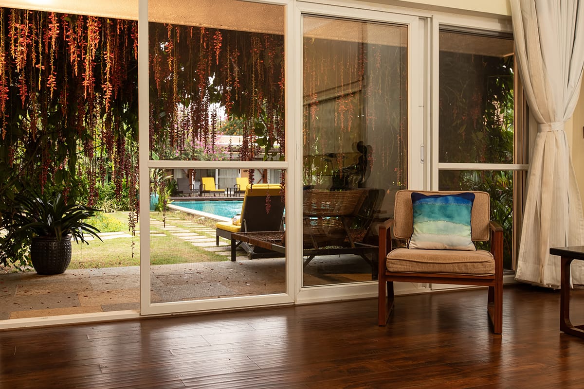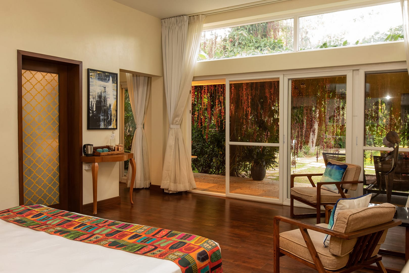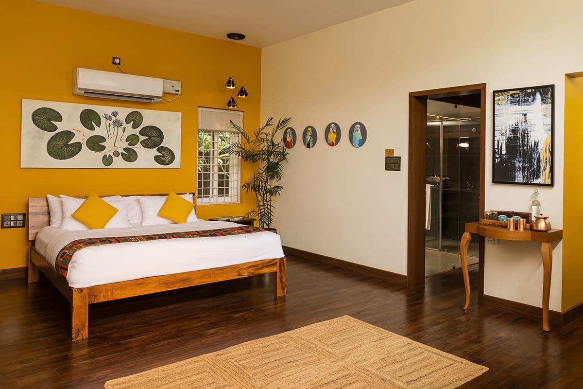 Spatika, once our guest room, has become a bright, airy retreat overlooking the pool. It features an American standard king bed with a queen stored beneath, both with individual cots. Families love the ease of pulling out the secondary bed in the evenings, creating generous space without clutter. A pergola with creepers, wooden flooring, and a walk-in wardrobe complete this elegant and thoughtful design.